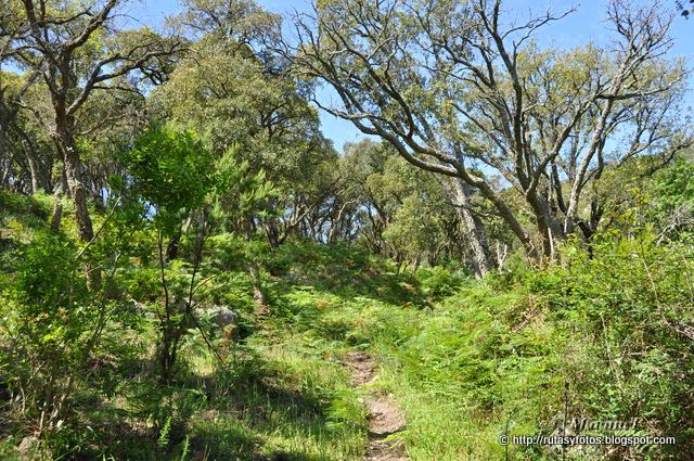 El sendero está marcado con hitos de piedras y en algunos tramos no está muy definido. Aunque transcurre paralelo al cauce del río, éste queda más abajo encajonado en la garganta. Caminamos entre alcornoques, quejigos y alisos (Alnus glutinosa).