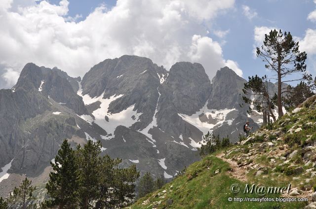 La subida se acentúa, ganamos altura y el paisaje cambia. Vemos el Pico de Estós, el Pico Estatás y al fondo entre nubes el Macizo de la Maladeta desde el Pico d'Alba hasta el Aneto.